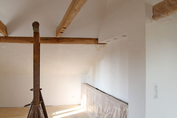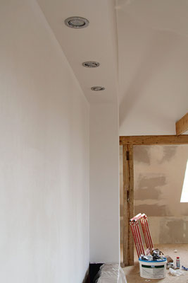 Auch im Bad ist nun die Decke fertig und im ersten Durchgang gespachtelt.